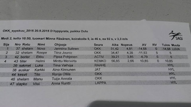 Kolmantena oli vuorossa Nova. Startattiin AVO-luokan ensimmäisenä ja se on meille huonoin lähtöpaikka, kun en ehdi Novan virettä laskemaan ennen radalle menoa. Niin kävi nytkin ja ääntelystä lähti yhteensä 6 pistettä, sen lisäksi tuli viisi -1 virhettä (